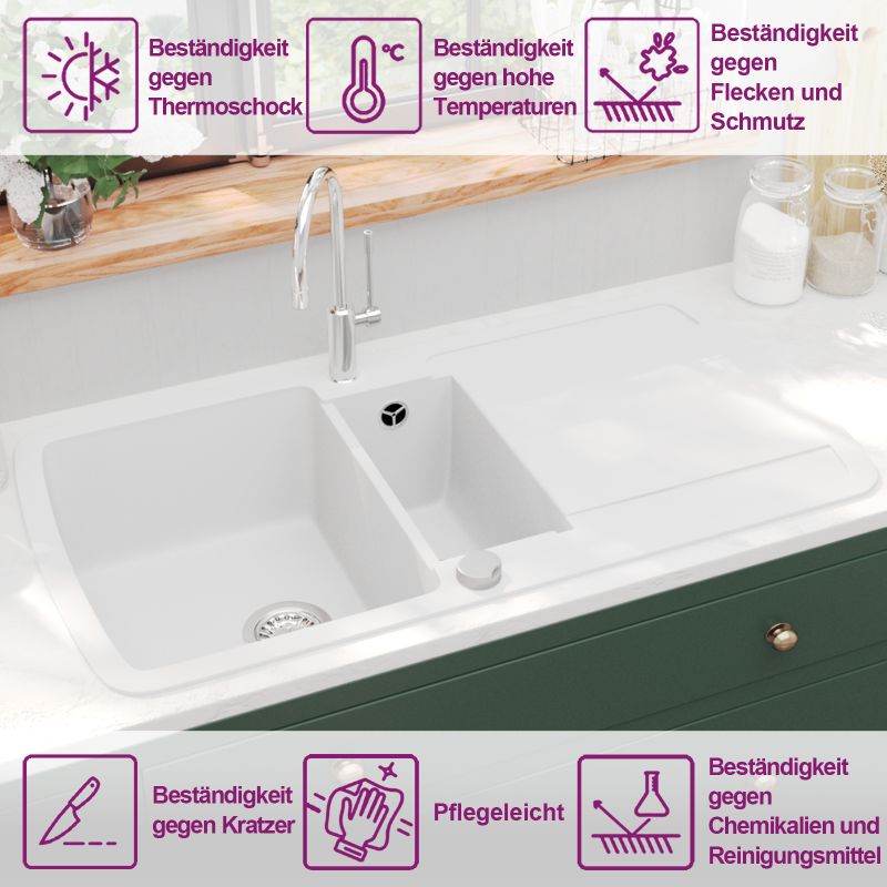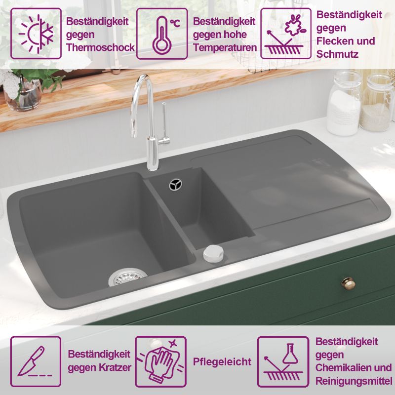 Unsere Granitspüle stellt eine zeitlose Bereicherung für Ihren Küchendekor dar. Sie verfügt über zwei Becken und ein elegantes Design. Dank qualitativ hochwertigem Granit ist das Spülbecken nicht nur schlagfest, hitze- und kratzbeständig sondern lässt sich auch ganz einfach reinigen. Die Spüle ist vollständig reversibel, so dass Sie diese Spüle sowohl auf der rechten als auch auf der linken Seite einbauen können. Im Lieferumfang ist auch ein Siebkörbchen enthalten, um gröberen Schmutz beim Abwaschen aufzufangen. Die Montage der Spüle ist einfach.