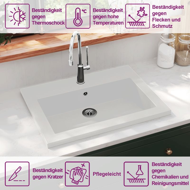 Dieses Waschbecken mit Überlauf wird eine großartige Ergänzung zu jedem Bad, jeder Toilette oder Garderobe sein. Der glasierte Granit und das moderne Design passen zu jedem Dekor. Ein Überlauf ist so ausgestattet, dass das Wasser abfließen kann, wenn das Becken voll ist. Im Lieferumfang ist eine Wasserhahnöffnung für die Montage eines Gewindebohrers enthalten. Das Wasserhahnloch hat einen Durchmesser von 35 mm. Das Waschbecken ist leicht zu reinigen. Bitte beachten Sie, dass die Wasserhähne und Abwasserleitungen nicht im Lieferumfang enthalten sind.
