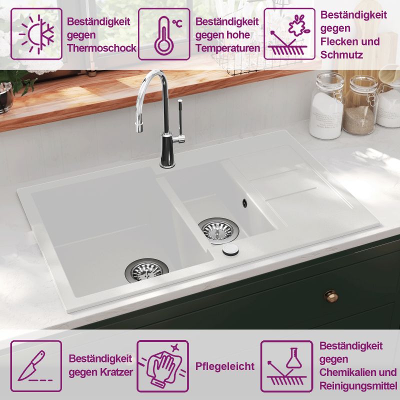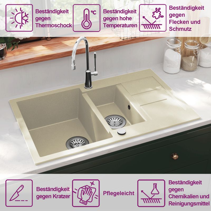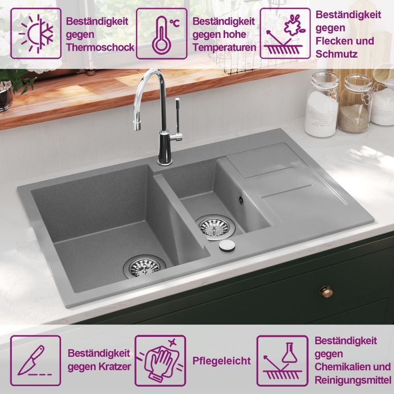 Unsere Granitspüle stellt eine zeitlose Bereicherung für Ihren Küchendekor dar. Sie verfügt über zwei Becken und ein elegantes Design. Dank qualitativ hochwertigem Granit ist das Spülbecken nicht nur hitzebeständig, kratzbeständig und schlagfest, sondern lässt sich auch ganz einfach reinigen. Es ist voll reversibel, was bedeutet, dass die Spüle rechts und links montiert werden kann. Dank des teilweise vorgebohrten Lochs können Sie das Wasserhahn einfach mit einem kleinen Hammer oder runden, röhrenartigen Werkzeugen herausschlagen. Eine Lochabdeckung aus Edelstahl ist enthalten, um das bereits gebohrte Loch vor Schmutz oder Staub zu schützen. Im Lieferumfang ist auch ein Siebkörbchen enthalten, um gröberen Schmutz beim Abwaschen aufzufangen. Die Montage der Spüle ist einfach.
