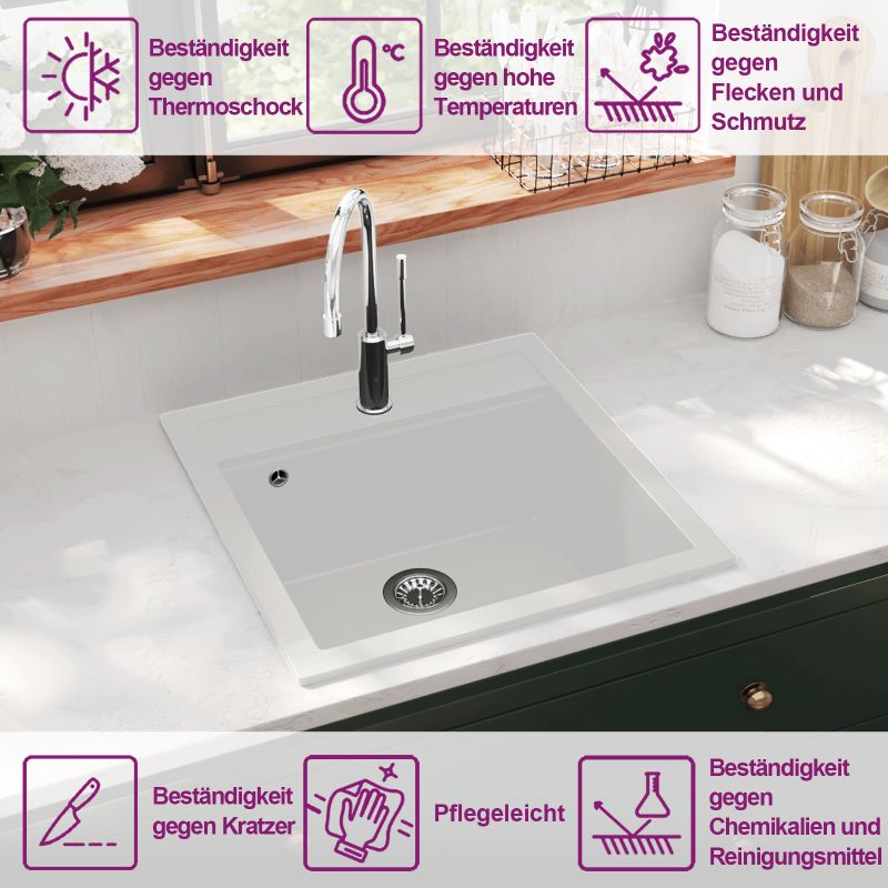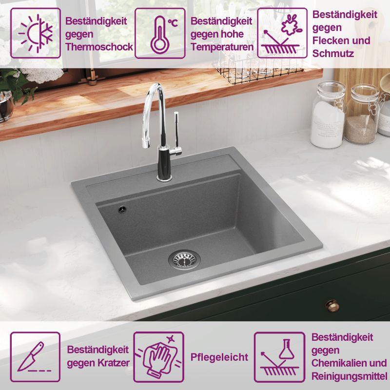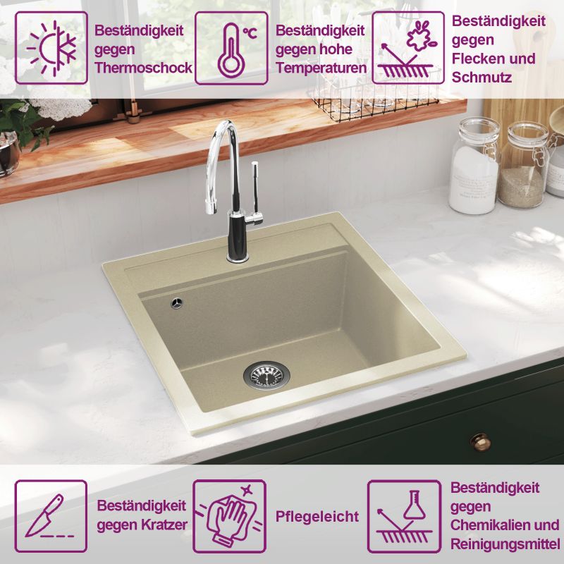 Unsere Granitspüle stellt eine zeitlose Bereicherung für Ihren Küchendekor dar. Sie verfügt über ein einzelnes, extra tiefes Becken und ein elegantes Design. Dank qualitativ hochwertigem Granit ist das Spülbecken nicht nur hitzebeständig, kratzbeständig und schlagfest, sondern lässt sich auch ganz einfach reinigen. Dank des teilweise vorgebohrten Lochs können Sie das Wasserhahn einfach mit einem kleinen Hammer oder runden, röhrenartigen Werkzeugen herausschlagen. In der Zwischenzeit können Sie es auch beibehalten, was Ihre Spüle vollständig bleibt, wenn Sie bereits einen Wasserhahn auf der Arbeitsplatte haben. Im Lieferumfang ist auch ein Siebkörbchen enthalten, um gröberen Schmutz beim Abwaschen aufzufangen. Die Montage der Spüle ist einfach.Stecker nicht im Lieferumfang enthalten.