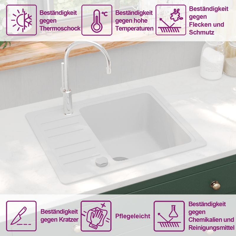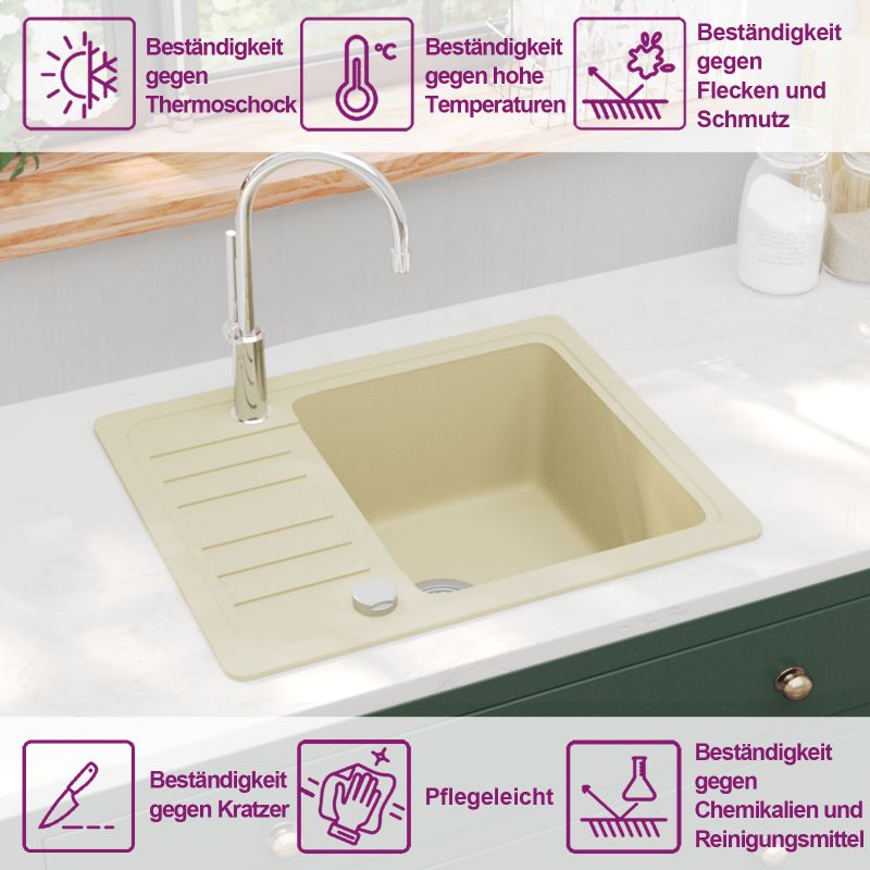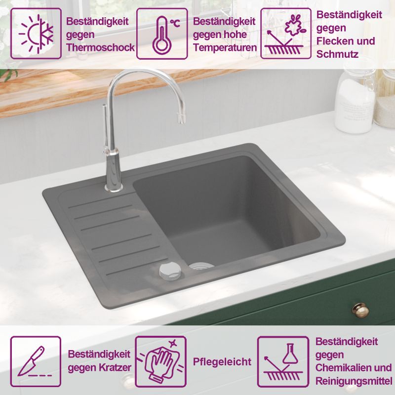 Unsere Granitspüle stellt eine zeitlose Bereicherung für Ihren Küchendekor dar. Sie verfügt über ein einzelnes, extra tiefes Becken und ein elegantes Design. Dank qualitativ hochwertigem Granit ist das Spülbecken nicht nur schlagfest, hitze- und kratzbeständig sondern lässt sich auch ganz einfach reinigen. Die Spüle ist vollständig reversibel, so dass Sie diese Spüle sowohl auf der rechten als auch auf der linken Seite einbauen können. Im Lieferumfang ist auch ein Siebkörbchen enthalten, um gröberen Schmutz beim Abwaschen aufzufangen. Die Montage der Spüle ist einfach.