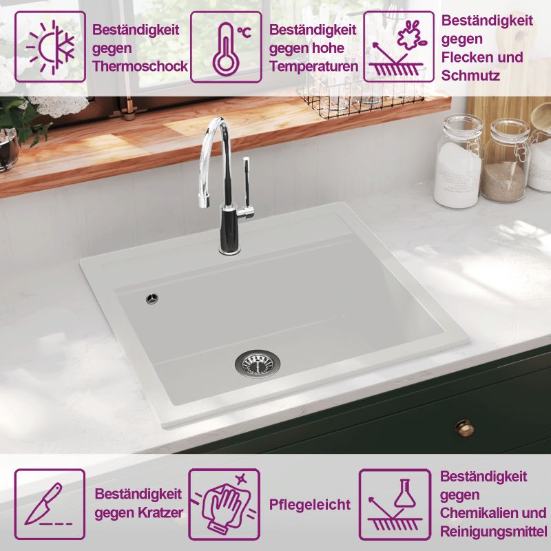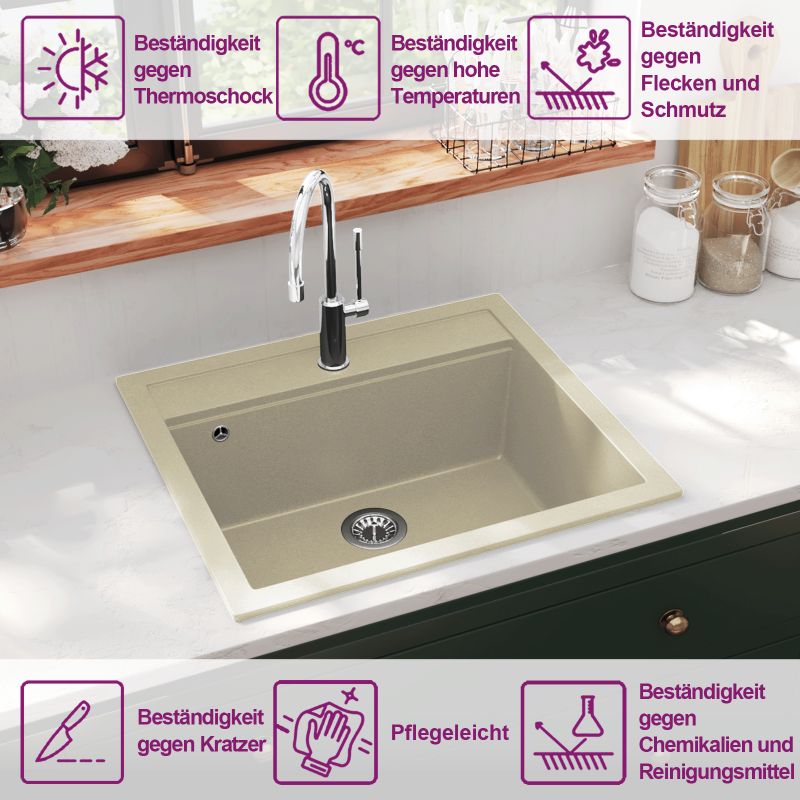 Unsere Granitspüle stellt eine zeitlose Bereicherung für Ihren Küchendekor dar. Sie verfügt über ein einzelnes, extra tiefes Becken und ein elegantes Design. Dank qualitativ hochwertigem Granit ist das Spülbecken nicht nur hitzebeständig, kratzbeständig und schlagfest, sondern lässt sich auch ganz einfach reinigen. Im Lieferumfang ist auch ein Siebkörbchen enthalten, um gröberen Schmutz beim Abwaschen aufzufangen. Die Montage der Spüle ist einfach.