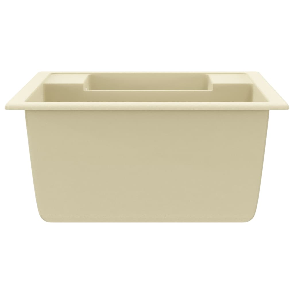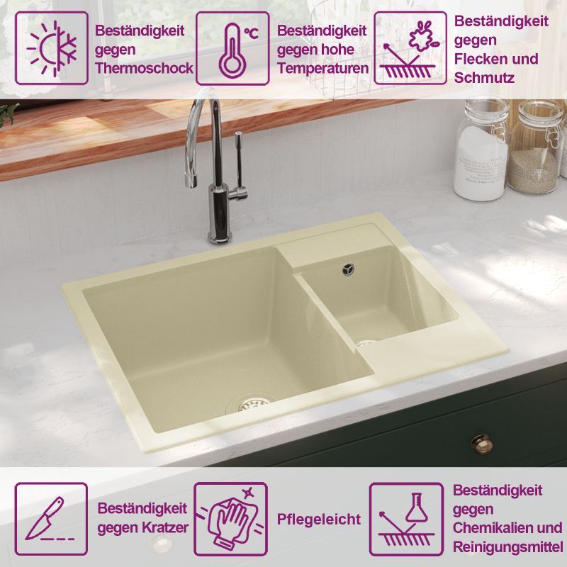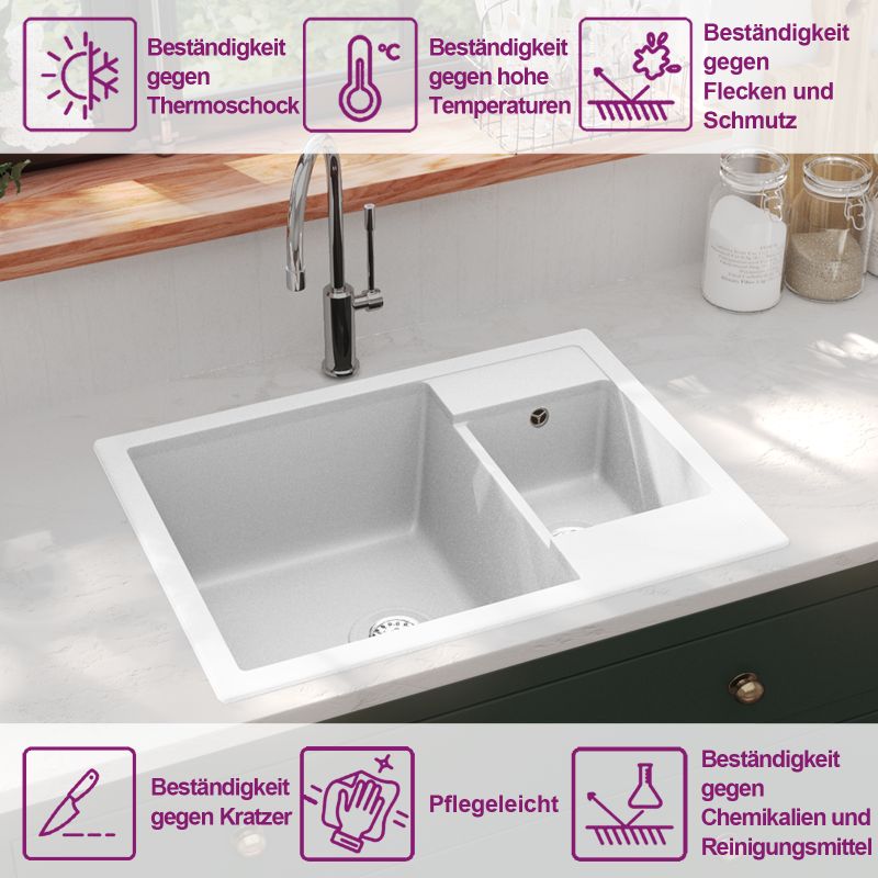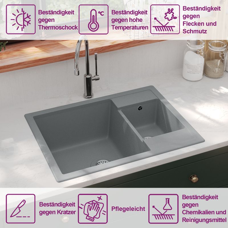 Dieses Granit-Spülbecken ist eine zeitlose Ergänzung zu Ihrem vorhandenen Küchendekor. Es verfügt über ein extra tiefes Becken, ein kleines Becken und ein schlankes Design. Die Spüle besteht aus Granit und ist hitzebeständig, kratz- und schlagfest sowie leicht zu reinigen. Ein Ablaufsieb ist, für einfaches Entfernen von Essensresten, ebenfalls im Lieferumfang enthalten. Die Abflussöffnung hat einen Durchmesser von 90 mm. Dieses Spülbecken ist für die Aufsatzmontage geeignet.