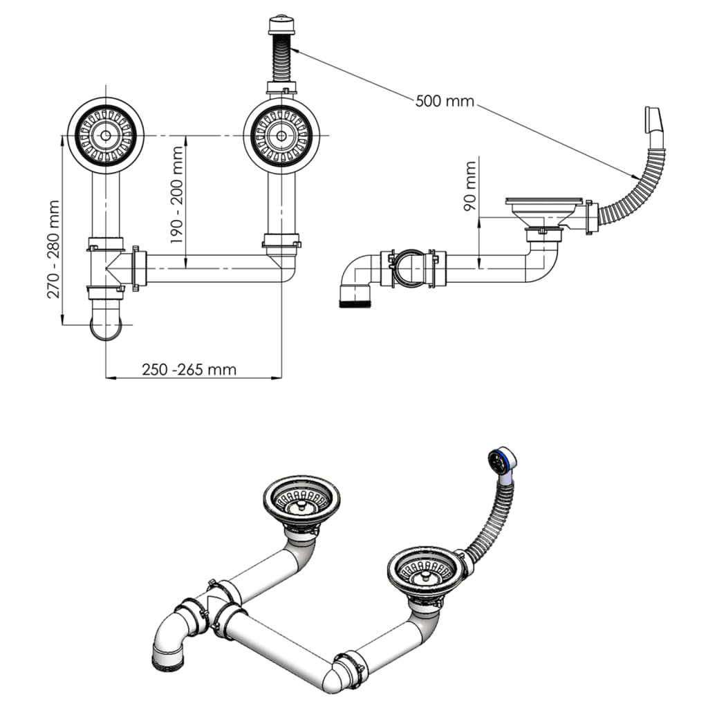 • Abmessungen des kleinen Beckens: 162 x 305 x 100 mm (B x T x H)