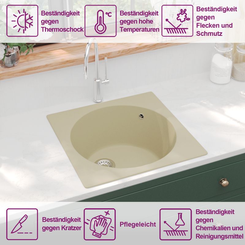 Dieses Granit-Spülbecken ist eine zeitlose Ergänzung zu Ihrem vorhandenen Küchendekor. Es verfügt über ein einzelnes, extra tiefes Becken und ein schlankes Design. Die Spüle besteht aus Granit und ist hitzebeständig, kratz- und schlagfest sowie leicht zu reinigen. Ein Ablaufsieb ist, für einfaches Entfernen von Essensresten, ebenfalls im Lieferumfang enthalten. Die Abflussöffnung hat einen Durchmesser von 90 mm. Dieses Spülbecken ist für die Aufsatzmontage geeignet.